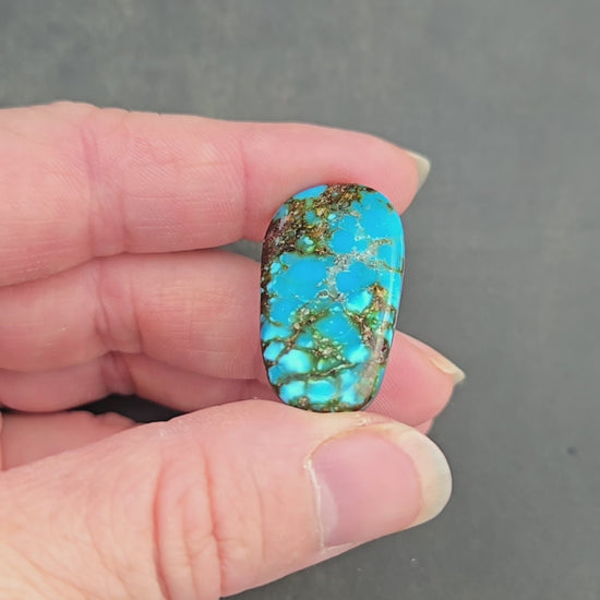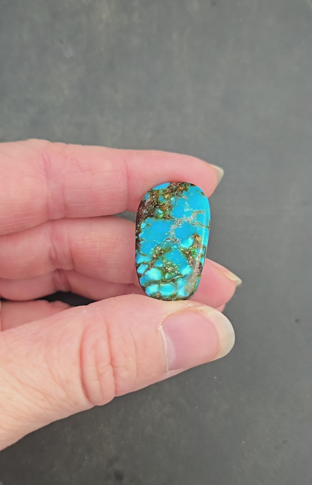 A striking piece of AAA High Blue Kingman Turquoise with red web. Known for its beautiful colors, Red Web Turquoise is known for its unique matrix patterns and variations, typically the presence of distinctive red or brown spiderweb. In the industry, the Kingman Mine, has also set the standard for blue matrix turquoise. This stone has beautiful color play that will stand out in any piece of jewelry.