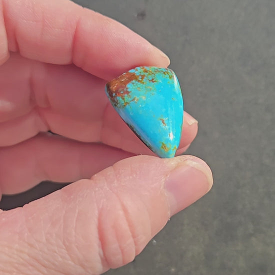 A striking piece of AAA High Blue Kingman Turquoise. This mine is known for its beautiful colors its unique matrix patterns and variations, and typically has the presence of distinctive red or brown spiderweb. In the industry, the Kingman Mine, has also set the standard for blue matrix turquoise. This stone has beautiful color play that will stand out in any piece of jewelry.