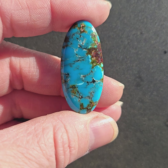 A striking piece of AAA High Blue Polychrome Kingman Turquoise with red web. This mine is known for its beautiful colors its unique matrix patterns and variations, and typically has the presence of distinctive red or brown spiderweb. In the industry, the Kingman Mine, has also set the standard for blue matrix turquoise. This stone has beautiful color play that will stand out in any piece of jewelry.