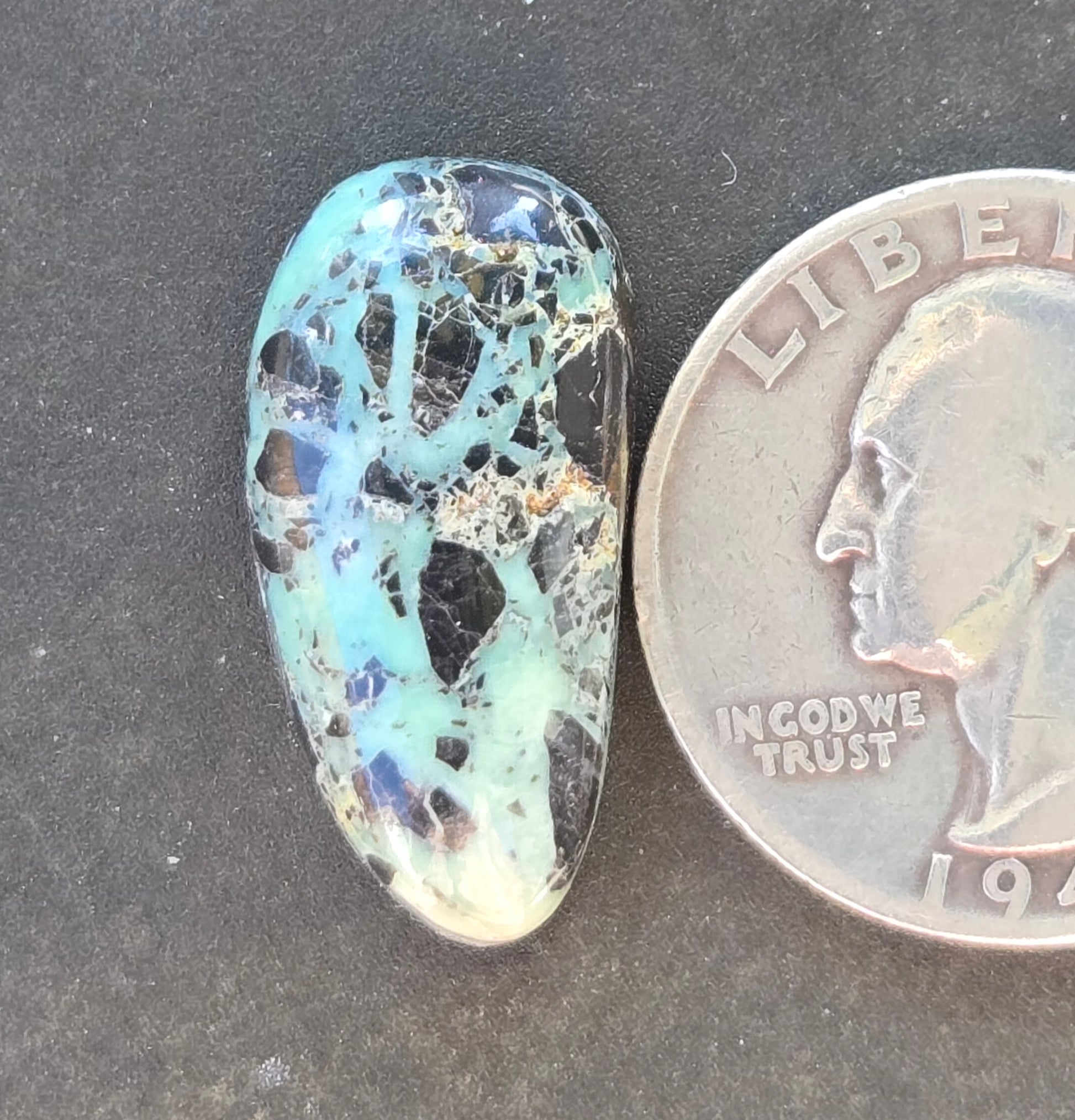 This beautiful long Aloe Variscite cabochon is stunning. The unique shape and color of the gemstone make it a one-of-a-kind addition to any jewelry collection. This cabochon is perfect for those looking to add a touch of elegance to their handmade jewelry designs. Whether you are a jewelry maker or a collector, this Aloe Variscite Cabochon is a must-have. Hand cut, polished, and backed.